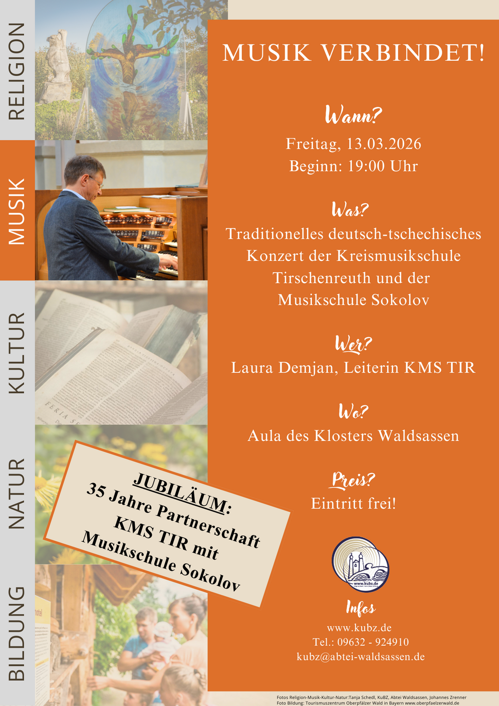 Am Freitag, den 13.03. findet um 19 Uhr in der Klosteraula in Waldsassen das grenzüberschreitende Konzert „Musik verbindet“ statt. Bei diesem traditionellen deutsch-tschechischen Konzert der KMS Tirschenreuth und der Musikschule Sokolov präsentieren talentierte junge Musikerinnen und Musiker ihr Können. In diesem Jahr feiert die Zusammenarbeit und Freundschaft zwischen den beiden Musikschulen zudem ihr 35-jähriges Bestehen.