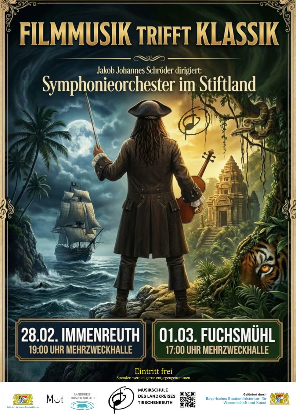 Unter der Leitung von Jakob Johannes Schröder präsentiert das Symphonieorchester im Stiftland ein Programm voller Emotion, Abenteuer und orchestraler Kraft. Freuen Sie sich auf eindrucksvolle Klangwelten, die Bilder im Kopf entstehen lassen und das Publikum auf eine Reise zwischen Filmepik und klassischer Tradition mitnehmen.