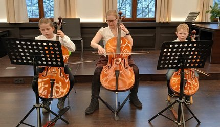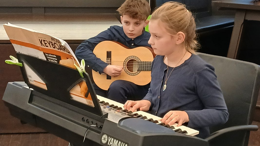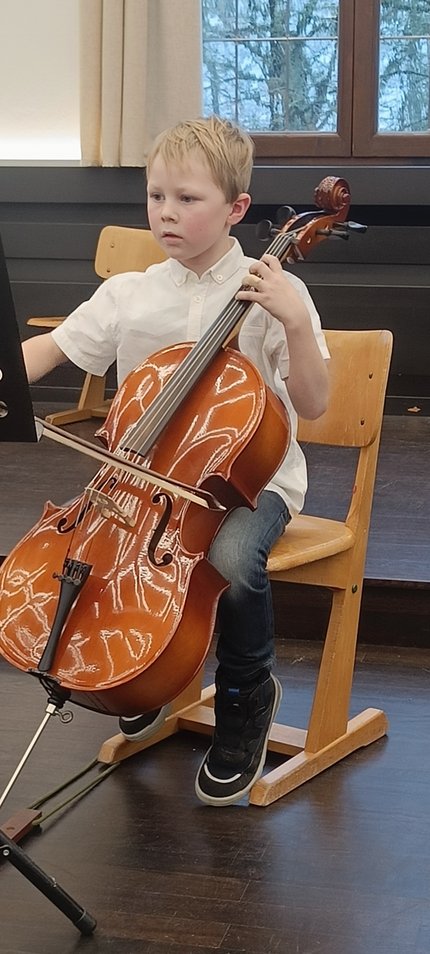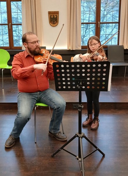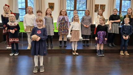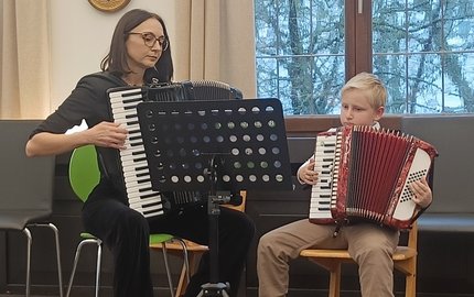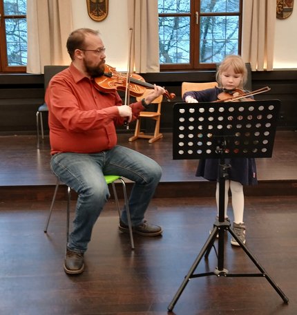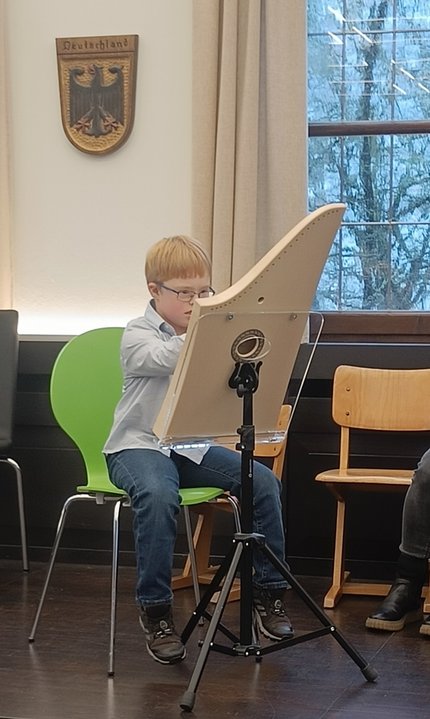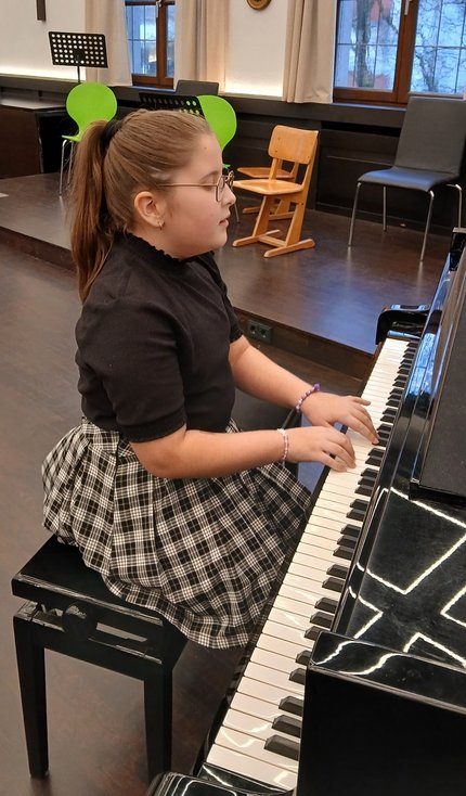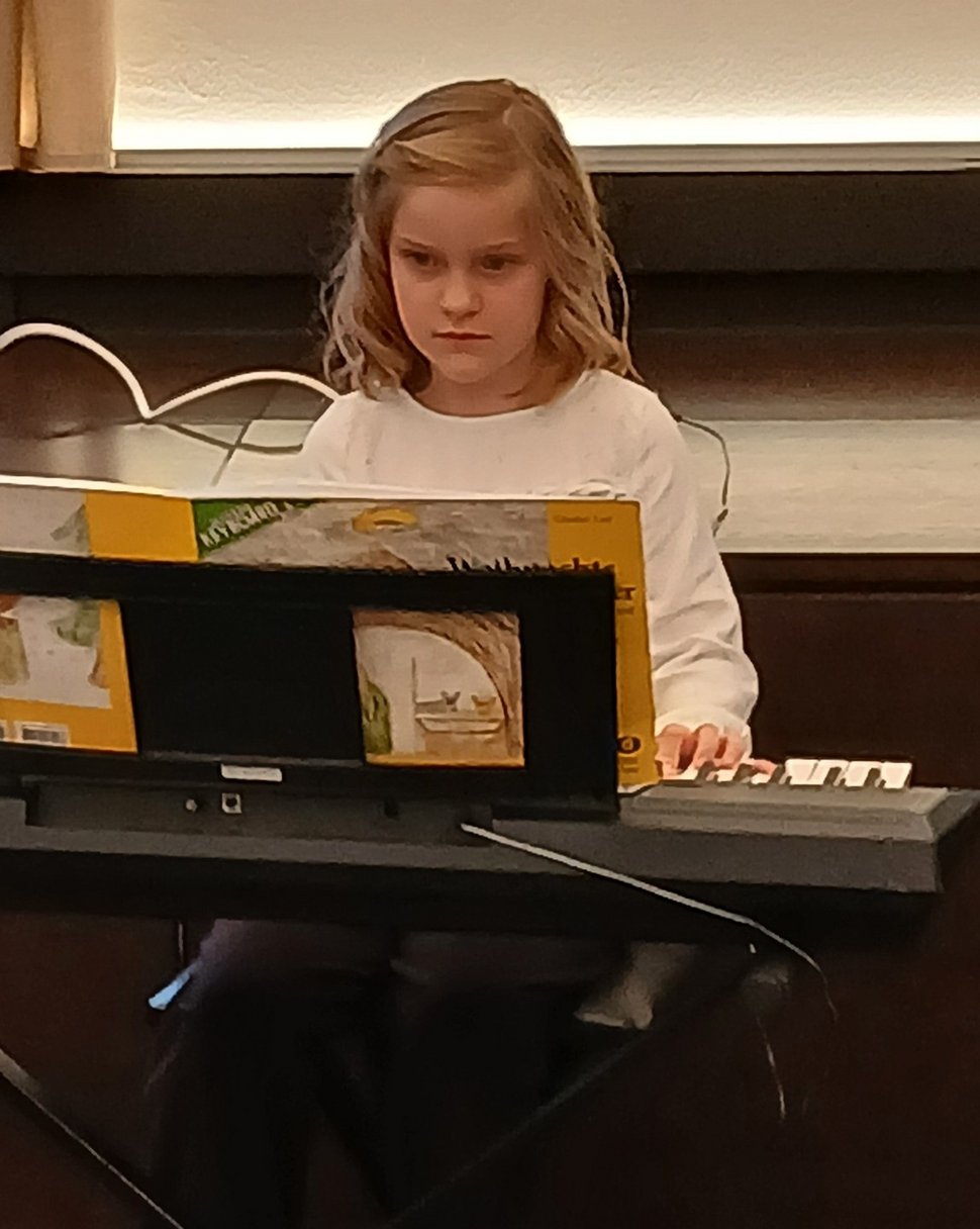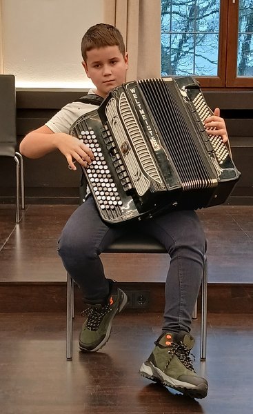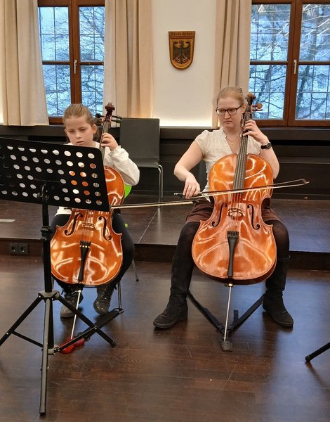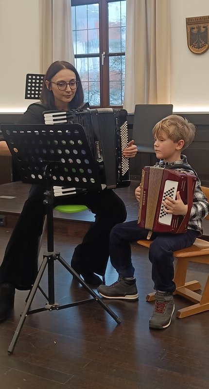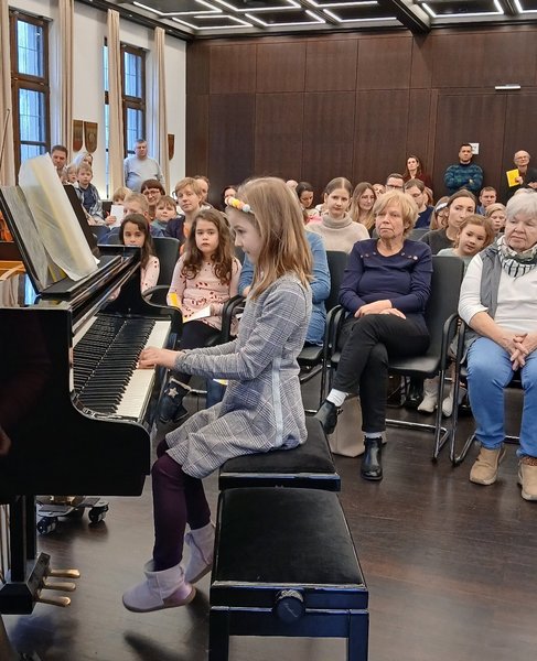 Die Singklassen Bärnau und Großkonreuth unter der Leitung von Maryna Hulyk besangen alle Jahreszeiten mit „Ich lieb den Frühling“, und sorgten für lustige und aufregenden Stimmung mit „Die Affenrasen durch den Wald“. Es folgten klassische Advents- und Weihnachtslieder wie „Morgen kommt der Weihnachtsmann“, „Oh du fröhliche und „Lasst uns froh und munter sein“. Gemeinsam mit den Lehrkräften Veronika Hille, Margit, Sollfrank und Helmut Burkhardt erklangen auch viele vierhändige Weihnachtslieder am Flügel des Großen Sitzungssaal. Benedikt Neugirk, unterrichtet von KMS-Lehrkraft Stefanie Schenkl, verzauberte mit dem besonderen Klang seiner Tischharfe und ließ ein zartes „Lasst uns froh und munter sein“ erklingen. Mit „Kling Glöckchen, klingelingeling“, „Fröhliche Weihnacht überall“ und weiteren wunderbaren Liedern trugen auch die kleinen Violinen und Akkordeons, oft mit einer zweiten Stimme durch die Lehrkräfte Viktoria Obermaier und Jakob Johannes begleitet, zur weihnachtlichen Stimmung bei. Nina Gmeiner und Luisa Völkl sangen zu ihrem eigenen Klavierspiel Lieder wie „Leise rieselt der Schnee“ und „Am Weihnachtsbaum die Lichter brennen“. Patrik Zálesák spielte das moderne englische Weihnachtslied „Carol oft he Bells“ auswendig und rhythmisch sehr präzise am Akkordeon. Lucia Karakuzu und Karl Kaban ließen mit ihrer Cello-Lehrerin Kinga Schröder ein dreistimmiges, warmes „Hört der Engel helle Lieder“ erklingen. Auch Gitarren- und Keyboardschüler der Lehrkraft Christine Behr und Klavierschüler der Lehrkraft Laura Verdejo Romero spielten auf ihren Instrumenten besinnliche, stimmungsvolle Weihnachtslieder.