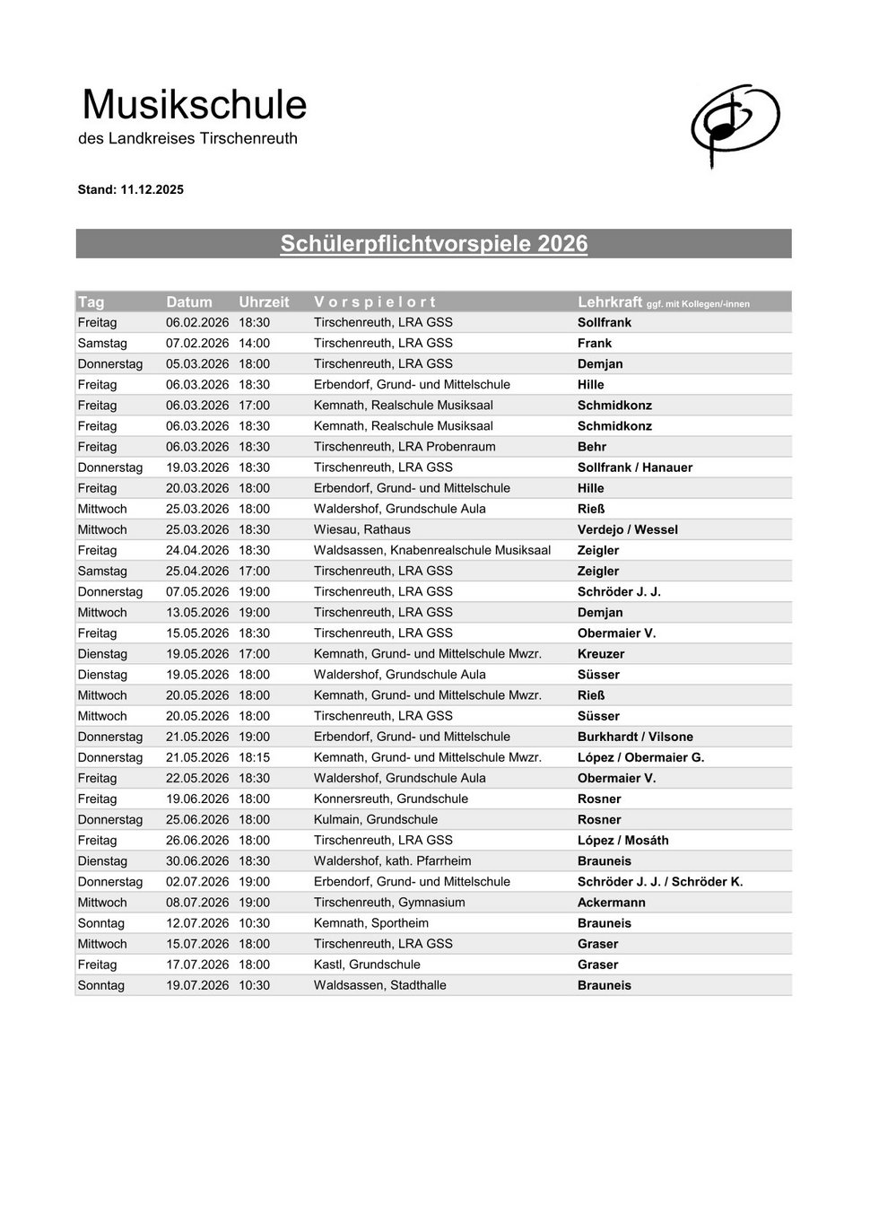 Hier finden Sie eine Übersicht mit unseren Terminen der Schülerpflichtvorspielen.