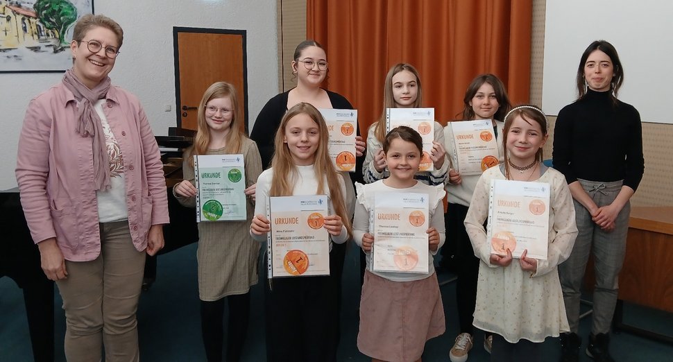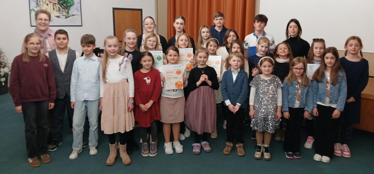 Stellvertretende Musikschulleiterin Klaudia Kornmann zeigte sich begeistert und lobte alle Mitwirkenden für ihre gelungenen Auftritte und die gute Vorbereitung. Nach dem Vorspiel versammelten sich alle Beteiligten für ein gemeinsames Foto.
