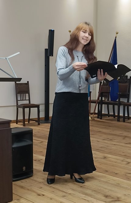Die seit März an der Kreismusikschule im Fach Musikalische Früherziehung tätige Lehrkraft Maryna Hulyk sang sowohl im Ensemble des Kammerchores, aber verzauberte das Publikum auch als Gesangssolistin mit zwei Liedern aus ihrer ukrainischen Heimat. Sehr gefühlvoll trug sie ein Abendlied von K. Stetsenko vor, und ließ in „Melodie“ von N. Skoryk ihren runden, weichen Sopran in der Höhe strahlen.